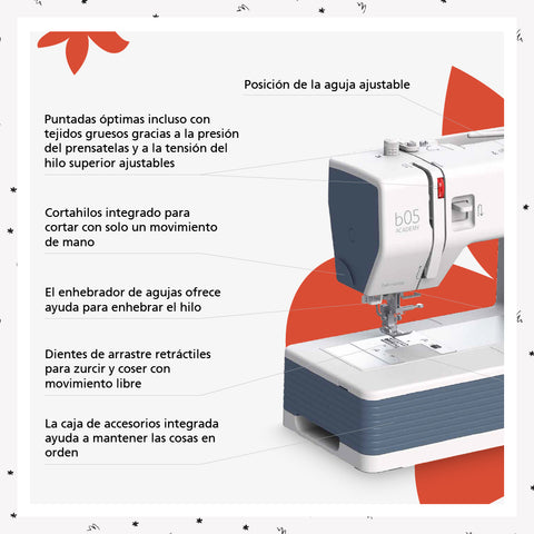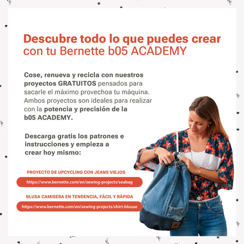 Descubre la Bernette B05 Academy: la máquina de coser que combina precisión suiza y facilidad de uso. Con 30 puntadas, enhebrador automático y potencia de 90W, cada costura será impecable. Potente, resistente y versátil, la B05 Academy es ideal para personas creativas que buscan rapidez y precisión. Desde prendas hasta accesorios, te permite completar tus ideas en poco tiempo.