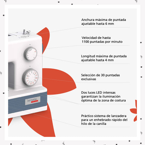 Combina diseño suizo y alto rendimiento, con un motor de 90W, 30 puntadas y control de velocidad sencillo. Es la compañera perfecta para cualquier proyecto, incluso los más exigentes, ofreciendo siempre resultados impecables